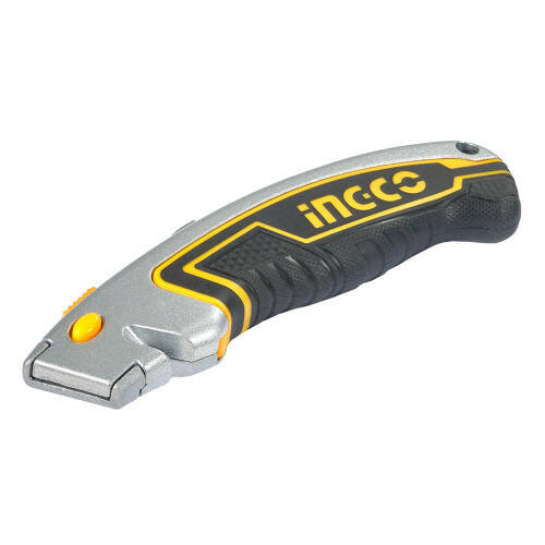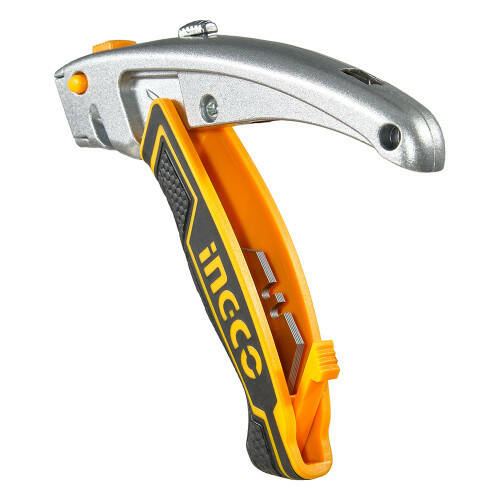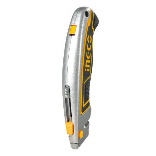 Ніж-трапеція "Profi" 6 лез SK5 INGCO INDUSTRIAL — універсальний інструмент для різання лінолеуму, картону, шпалер та інших матеріалів. Цей ніж є надійним та довговічним завдяки високоякісному лезу з вуглецевої сталі SK5, яке забезпечує відмінну гостроту і довгий термін служби. Корпус ножа виготовлений з цинкового сплаву, що захищає інструмент від механічних пошкоджень і гарантує йому високу міцність.