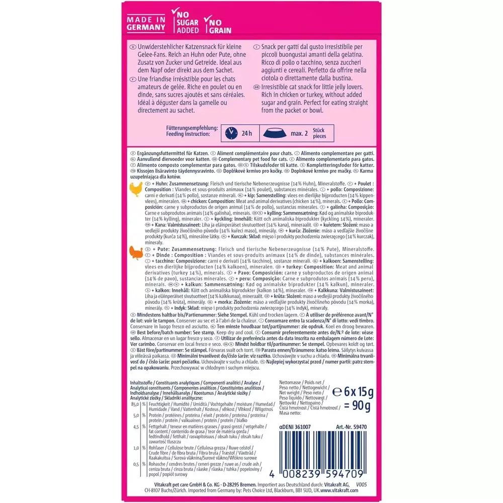 Набір ароматних вологих ласощів у вигляді желе з куркою та індичкою для котів. Апетитне частування дає змогу потішити улюбленця між основними прийманнями їжі. Низькокалорійне желе Vitakraft — це здоровий прикорм для котів, і до того ж чудові ласощі. Без цукру, злаків і консервантів.