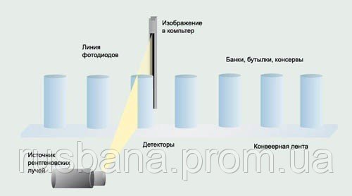 Продукт проходить горизонтальною конвеєрною стрічкою між джерелом рентгенівського випромінювання та їх приймачем. Рентгенівські промені поглинаються продуктом та сторонніми тілами. Рівень поглинання вищий для щільніших або потовщених об'єктів. Коли сторонні тіла виявлені, такі упаковки з продуктом видаляються з конвеєрної стрічки.