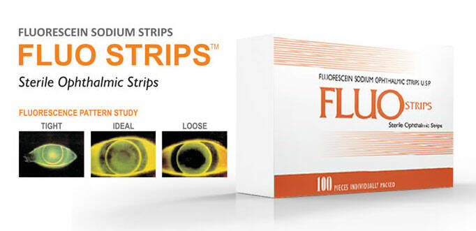 Офтальмологічні тест-смужки FluoStrips - це офтальмологічні тест-смужки, які застосовуються для діагностування пошкоджень епітелію кон'юнктиви та рогівки людського ока й ока тварин, а крім того для встановлення вірного положення жорстких контактних лінз (ЖКЛ) на оці. Кожна тест-смужка має дієву речовину - флюоресцеїн низькомолекулярний в кількості 1 мг Fluorescein Sodium, флюоресцеїн низькомолекулярний це барвник жовтого забарвлення.