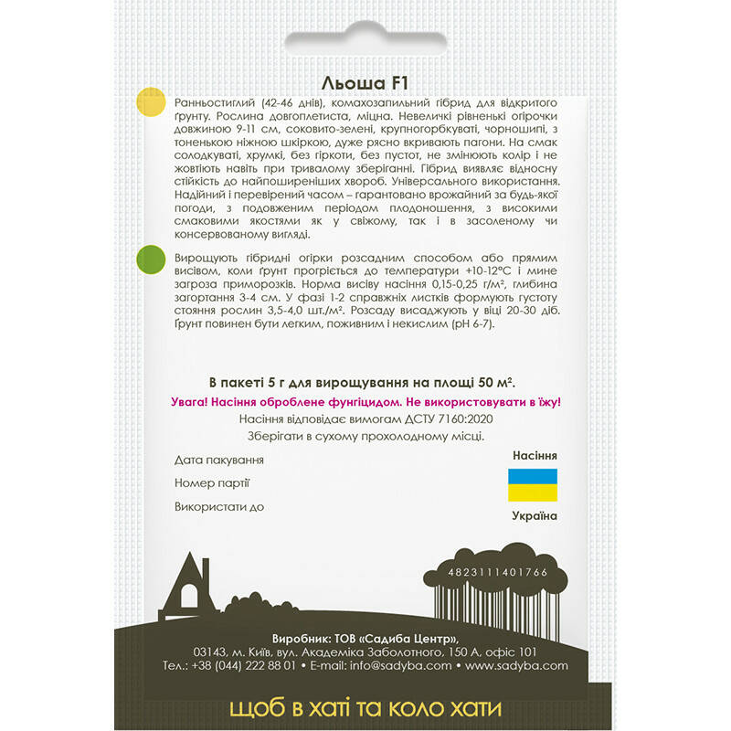 Льоша F1 – надранній (від сходів до початку плодоношення 35 - 40 днів) комахозапильний гібрид, який поєднує в собі найкращі якості: стійкість до хвороб, урожайність і універсальність призначення. Зеленці соковито - зелені, невеликі, проте рясно вкривають кущ, чорношипі, смачні та дуже ароматні. Гібрид відзначається стійкістю до борошнистої роси і вірусу огіркової мозаїки.