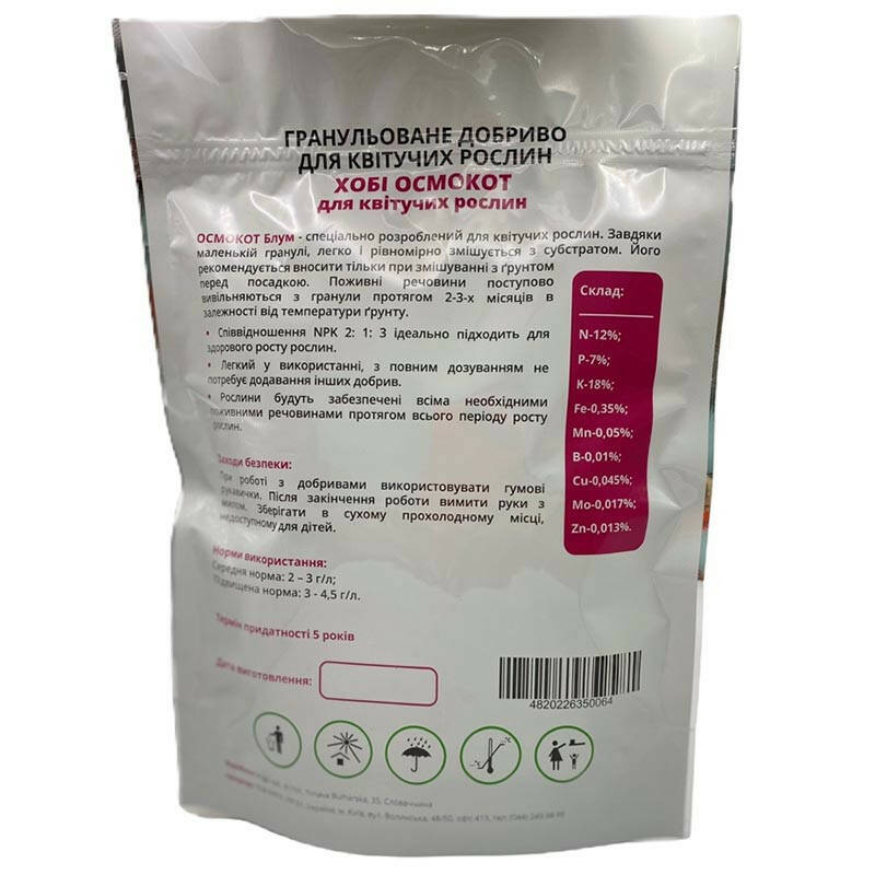 Осмокот мінеральне добриво – це добриво має спеціально розроблену формулу, яка сприяє інтенсивному росту кореневої системи та активному цвітінню рослин. Воно допомагає збільшити кількість бутонів, робить квітки яскравішими та більш стійкими до стресових умов. Головною особливістю підгодівлі, є її препаративна форма - гранули маленького розміру, які швидко і рівномірно змішуються з ґрунтом, та харчують рослини, навіть у маленьких горщиках протягом 2-3 місяців. На гранулах присутня спеціальна напівпроникна оболонка Fusion, через яку проникає вода і розчиняє поживні речовини всередині гранул. Через різного осмотичного тиску, відбувається дозоване і повільне вивільнення мінералів.