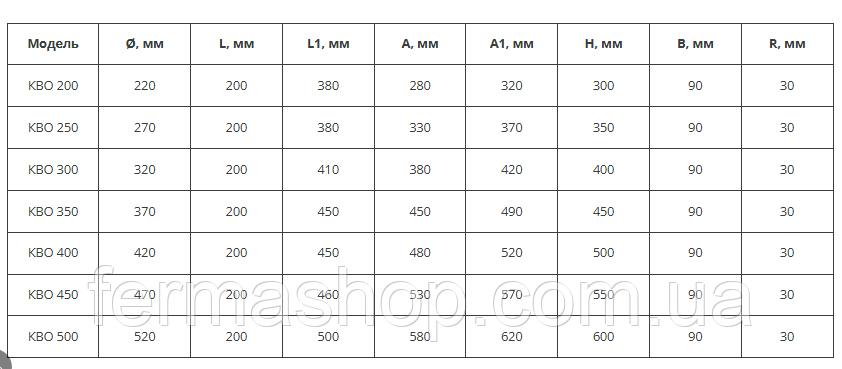 Розміри вентиляторів КВО вказані у таблиці (дивись фото)