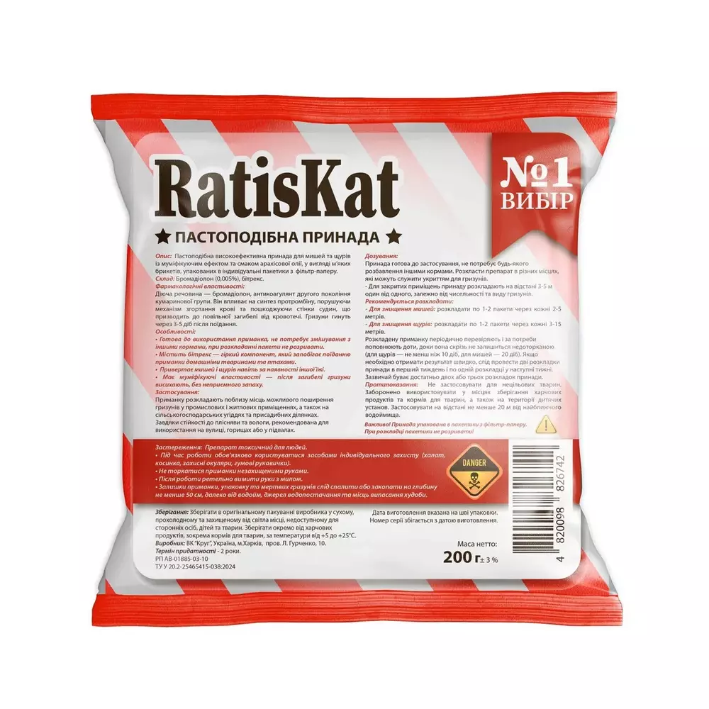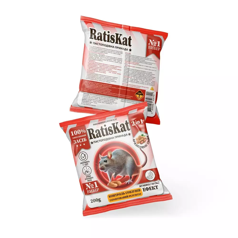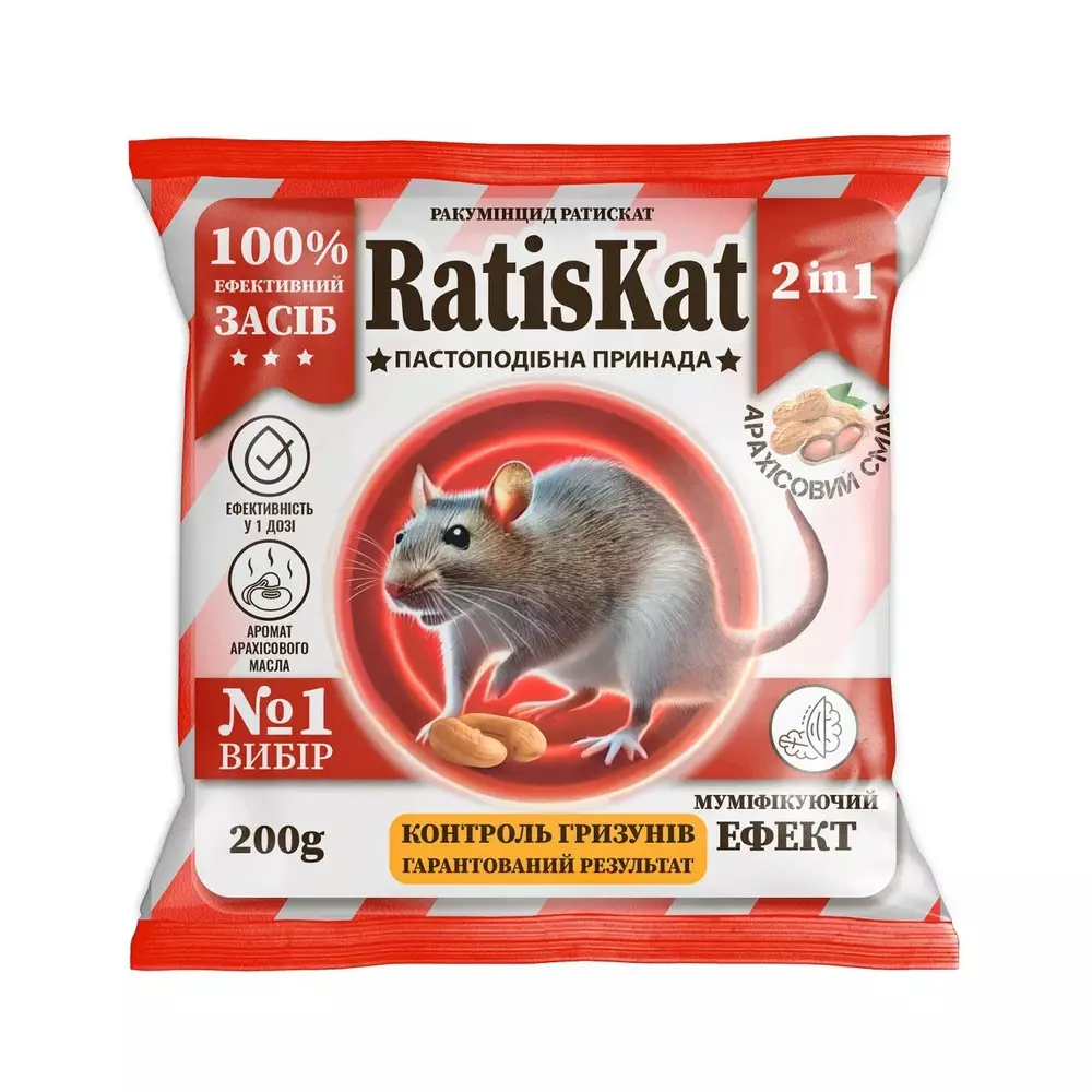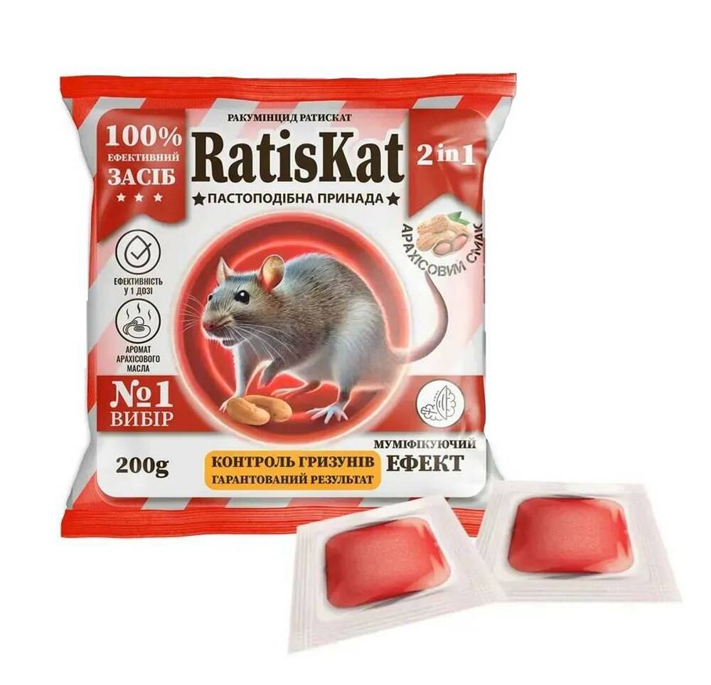 Отрута для щурів РАКУМІНЦИД РАТИСКАТ у вигляді пастоподібної принади рекомендована для ефективного знищення мишей та щурів із муміфікуючим ефектом. М’які брикети зі смаком арахісової олії яскравого (червоного, зеленого та інших) кольору упаковані в індивідуальні пакетики з фільтрувального паперу.