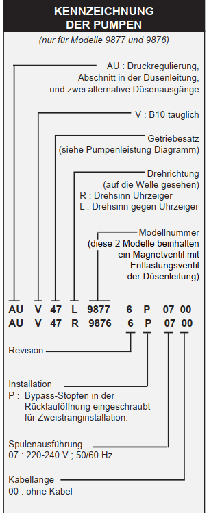 Рідкопаливний шестереньчастий насос E 1001 містить клапан, що регулює тиск, з функцією замикання. Виконання аналогічне насосам J, але насоси Е також можуть бути використані для мазута.