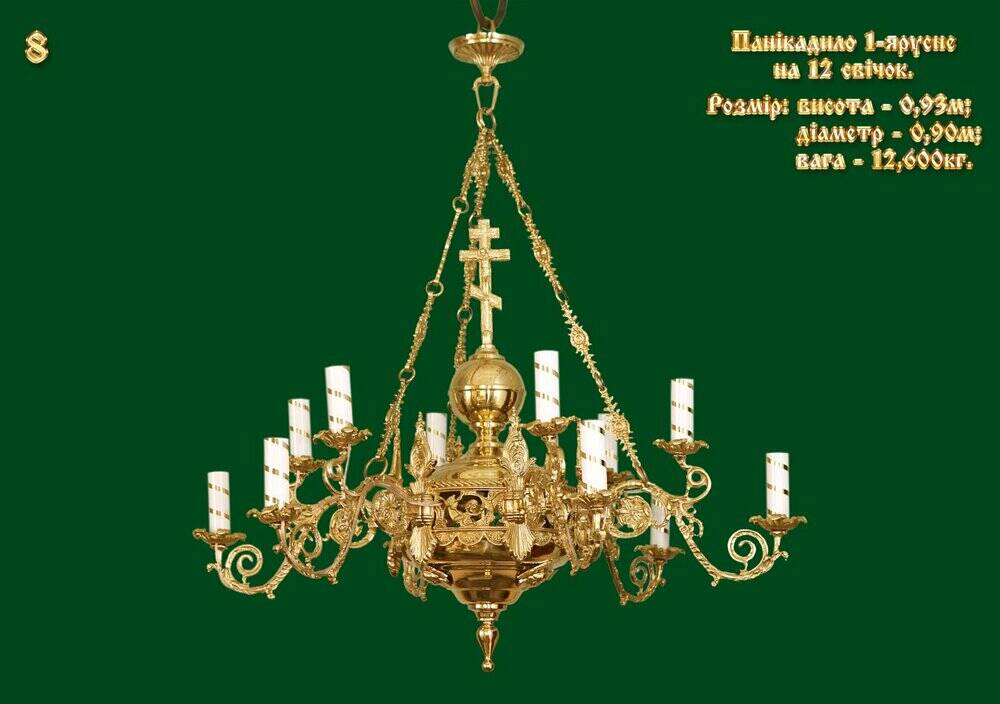 Купити панікадило ручної роботи, золотистого кольору, 1 одноярусне на 12 електричних ламп у вигляді свічок. За бажанням електричні лампочки можна замінити на свічники для свічок будь-якого діаметра.