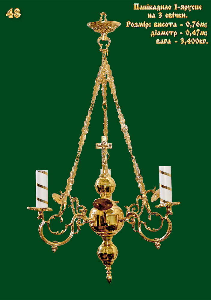 Церковне 1-ярусні панікадило на 3 свічки виготовлено з високоякісного сплаву латуні. Всі покриття конструкції виконані "під золото" і прикрашені різноманітними декоруючими елементами. При виготовленні використовувалася латунь, яка є ідеальним матеріалом для таких виробів.