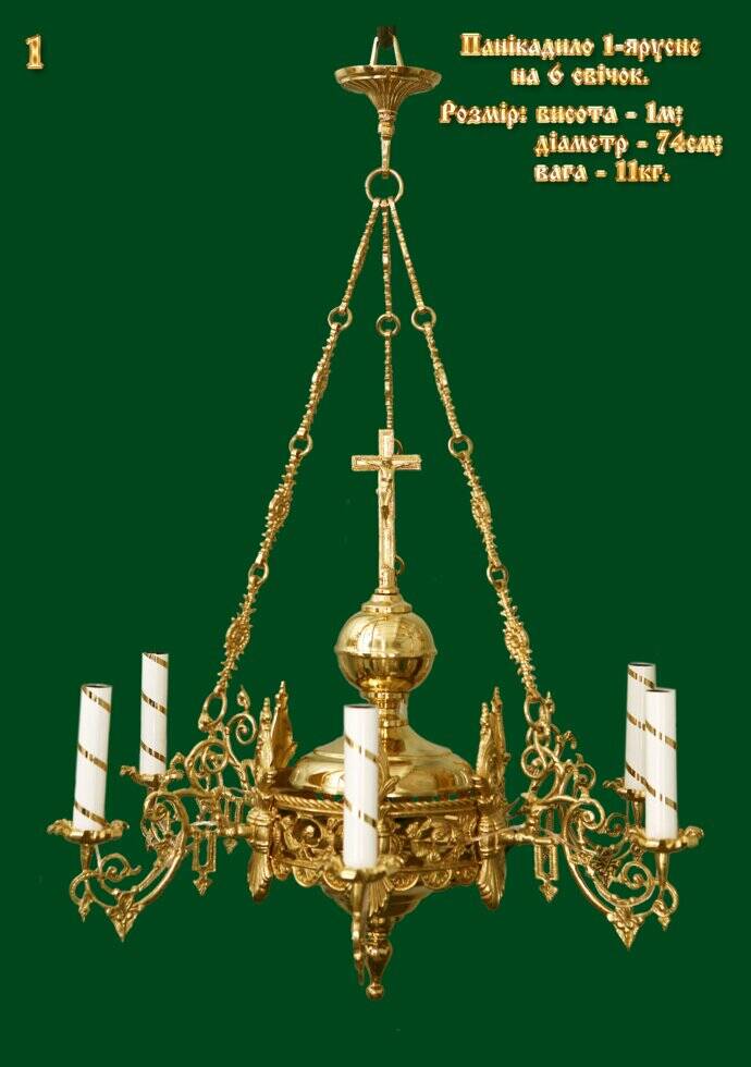 Панікадило 6 плот ручної роботи, золотистого кольору, 1 одноярусне на 6 електричних ламп у вигляді свічок. За бажанням електричні лампочки можна замінити на свічники для свічок будь-якого діаметру.