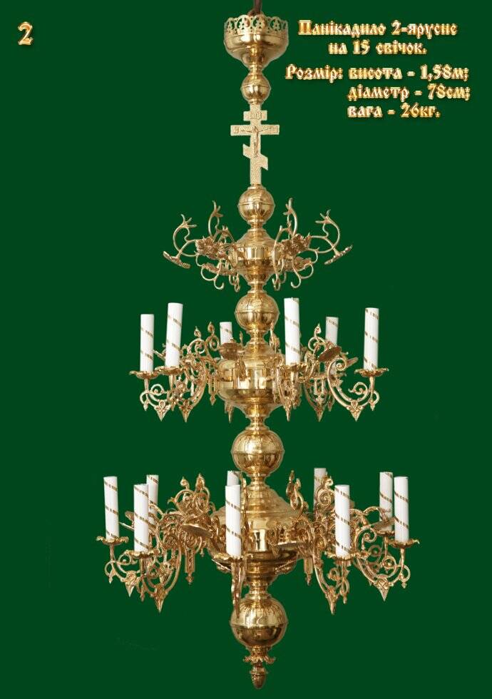 Панікадило ручної роботи, золотистого кольору, 2 двоярусні на 15 електричних ламп у вигляді свічок. За бажанням електричні лампочки можна замінити на свічники для свічок будь-якого діаметру.