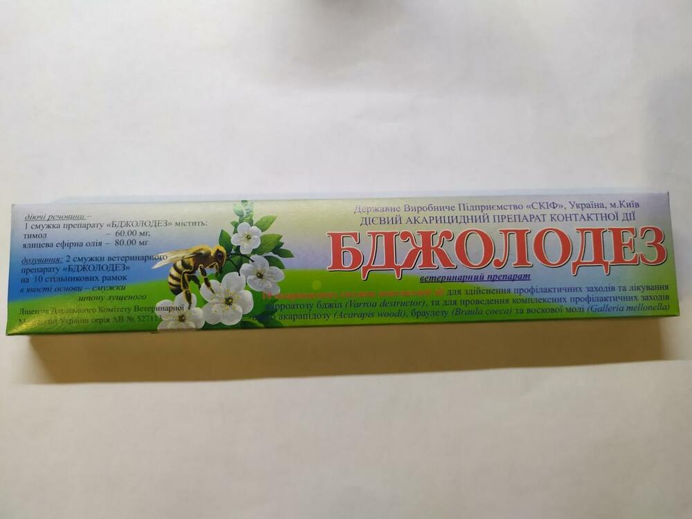 Препарат «Бджолодез» не містить синтетичних хімічних речовин антибіотиків, інсектицидів, фунгіцидів Препарат «Бджолодез» може використовуватися без суттєвих обмежень за термінами медозбору та пори року, оскільки природні екологічно чисті компоненти препарату «Бджолодез» не накопичуються у меді та інших продуктах бджільництва. Тривале систематичне використання смужок препарату «Бджолодез» не призводить до виникнення нових популяцій кліщів підвищеної резистентності. заходів з акарапідозу (Acarapis woodi), браулез (Braula coeca) та воскової молі (Galleria mellonella). Форма випуску: Фольгований полімерний пакет, що містить 10 смужок з дерев'яного шпону розміром 200х20х0,8 мм. />