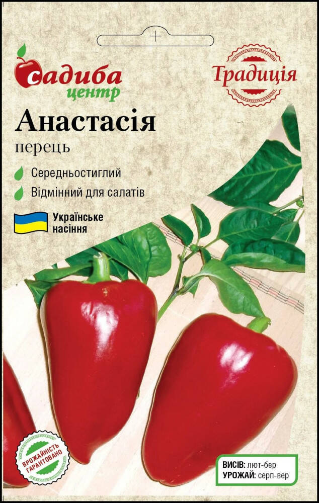 Анастасія – середньостиглий сорт відмінних то - варних і смакових якостей. Кущ висотою 60 - 80 см, утворює красиві конусовидні, товстостінні та соковиті плоди від темно - зеленого до темно - вишневого кольору, масою 150 - 250 г. Насіння ви - сівайте на розсаду в лютому - березні, у віці 60 - 65 днів пересадіть на постійне місце, після загрози заморозків у похмурі дні або у вечірній час. Щоб отримати хороший урожай - забезпечуйте розсаду рівномірним, хорошим поливом.