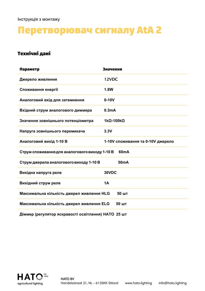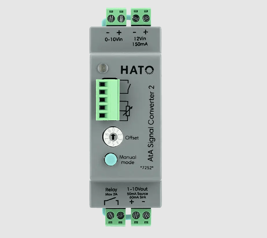 Перетворювач сигналу AtA 2 перетворює сигнал регулювання яскравості 0-10 В на сигнал 1-10 В. Можна задати зміщення, щоб гарантувати увімкнення світла при 10% (вхід 1 В).