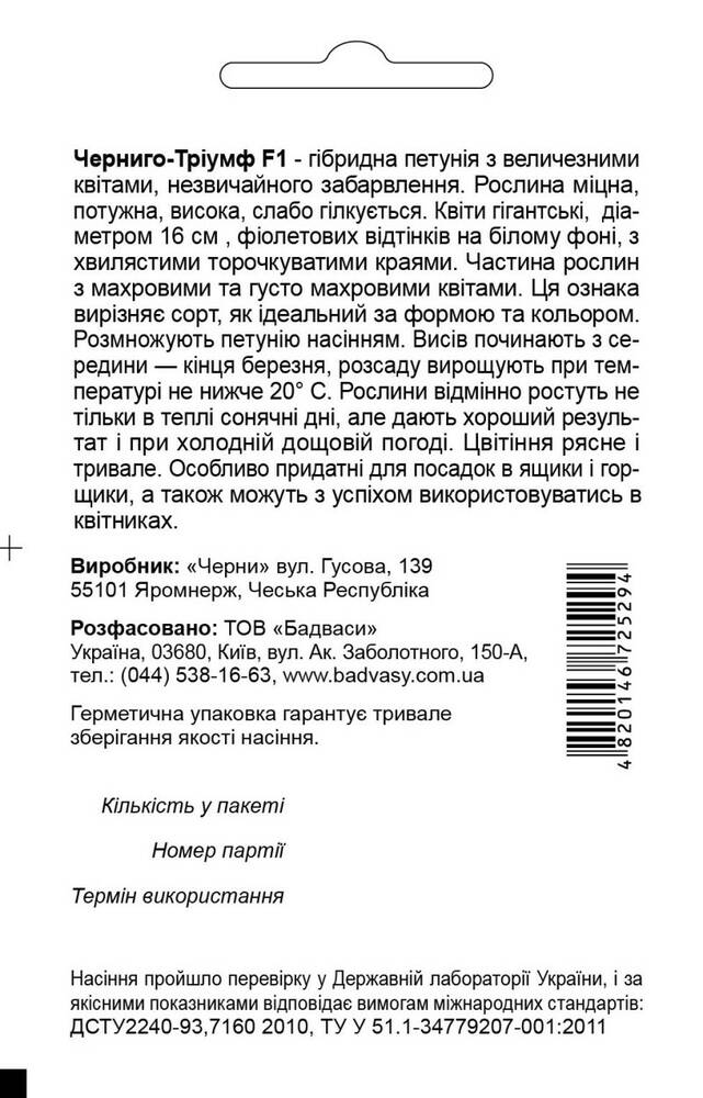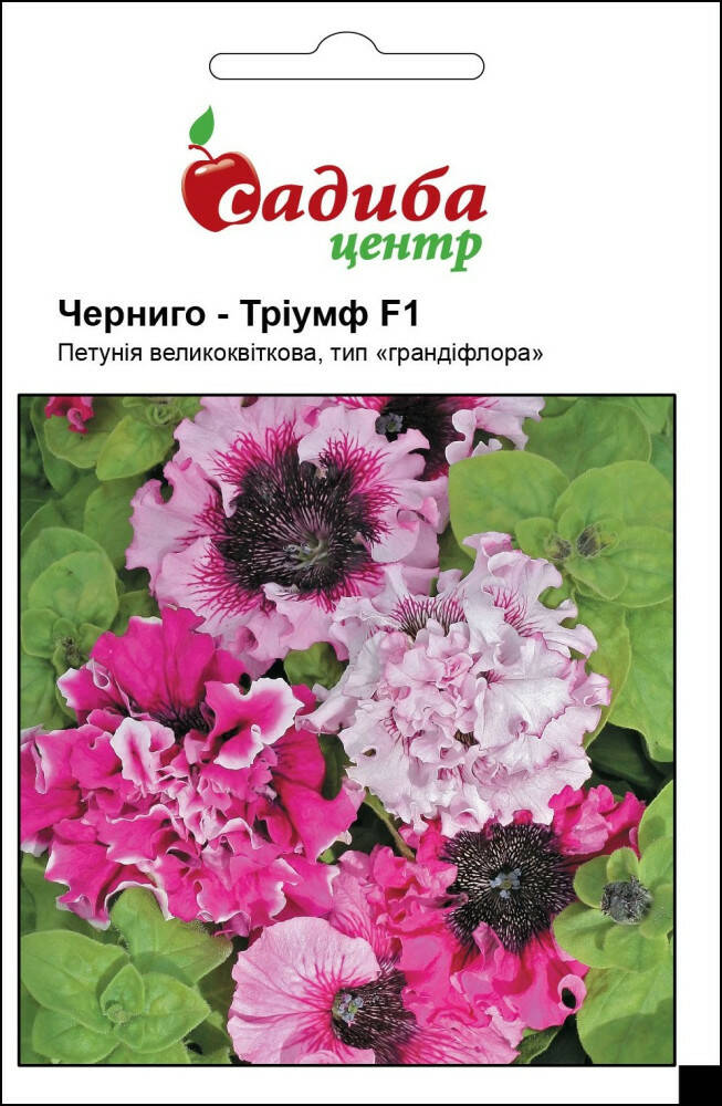 Петунія Черниго Тріумф F1 - гібридна петунія з величезними квітами, незвичайного забарвлення. Рослина міцна, потужна, висока, слабо гілкується. Квіти гігантські, діаметром 16 см , фіолетових відтінків на білому фоні, з хвилястими торочкуватими краями. Частина рослин з махровими та густо махровими квітами. Ця ознака вирізняє сорт, як ідеальний за формою та кольором. Розмножують петунію насінням за допомогою розсади. Висів починають з середини — кінця березня, розсаду вирощують при температурі не нижче 20° С. Рослини відмінно ростуть не тільки в теплі сонячні дні, але дають хороший результат і при холодній дощовій погоді. Цвітіння рясне і тривале. Особливо придатні для посадок в ящики і горщики, а також можуть з успіхом використовуватись в квітниках.