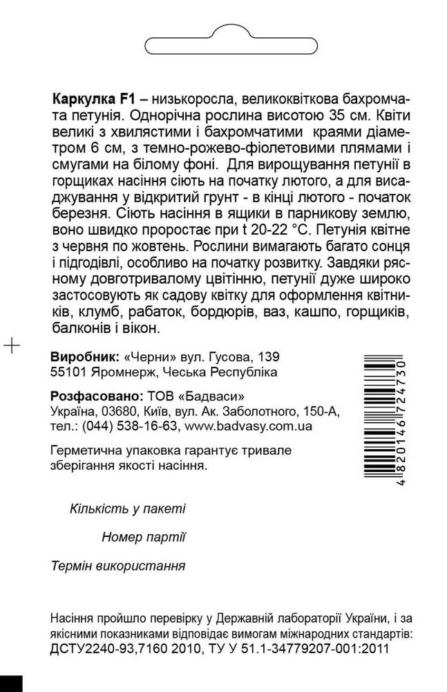 Петунія Каркулка F1 – низькоросла, великоквіткова бахромчата петунія. Однорічна рослина висотою 35 см. Квіти великі з хвилястими і бахромчатими краями діаметром 6 см, з темно-рожево-фіолетовими плямами і смугами на білому фоні. Для вирощування петунії в горщиках насіння сіють на початку лютого, а для висаджування у відкритий грунт - в кінці лютого - початок березня. Сіють насіння в ящики в парникову землю, воно швидко проростає при t 20-22 °С. Петунія квітне з червня по жовтень. Рослини вимагають багато сонця і підгодівлі, особливо на початку розвитку. Завдяки рясному довготривалому цвітінню, петунії дуже широко застосовують як садову квітку для оформлення квітників, клумб, рабаток, бордюрів, ваз, кашпо, горщиків, балконів і вікон.