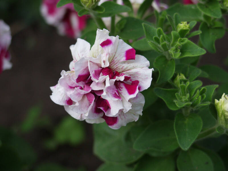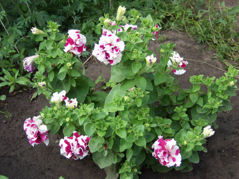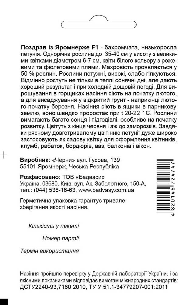 Петунія Поздрав із Яромнерже F 1 - бахромчата, сереньо росла петунія. Однорічна рослина до 35-40 см у висоту з великими квітками діаметром 6-7 см, квіти білого кольору з рожевими та фіолетовими плями. Махровість проявляється у 50 % рослин. Рослини потужні, високі, слабо гілкуються. Відмінно ростуть не тільки в теплі сонячні дні, але дають хороший результат і при холодній дощовій погоді. Для вирощування в горщиках насіння сіють на початку лютого, а для висаджування у відкритий грунт - наприкінці лютого-початку березня. Насіння сіють в ящики в парникову землю, воно швидко проростає при t 20-22 ° С. Рослини вимагають багато сонця і підгодівлі, особливо на початку розвитку. Цвітуть з кінця червня і аж до заморозків. Завдяки рясному довготривалому цвітінню петунії дуже широко застосовують як садову квітку для оформлення квітників, клумб, рабаток, бордюрів, ваз, балконів і вікон.