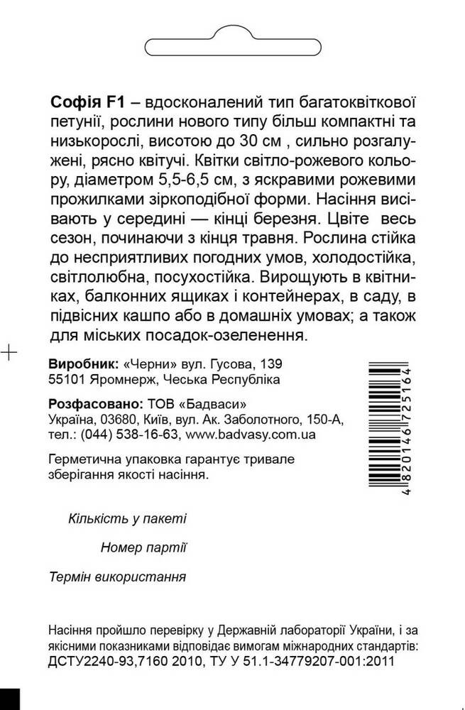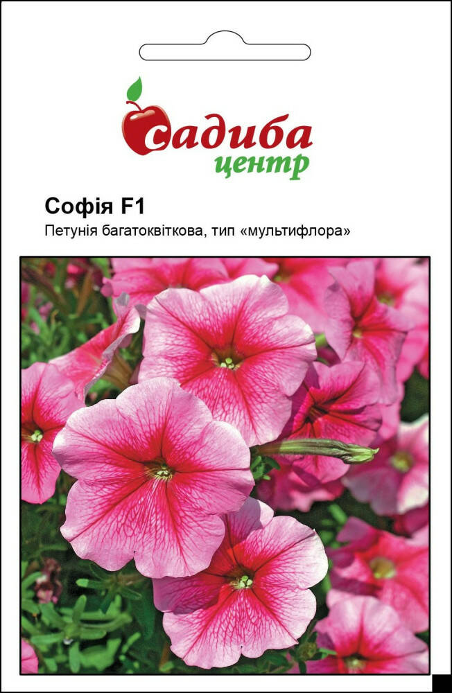 Петунія Софія F1 – вдосконалений тип багатоквіткової петунії, рослини нового типу більш компактні та низькорослі, висотою до 30 см , сильно розгалужені, рясно квітучі. Квітки світло-рожевого кольору, діаметром 5,5-6,5 см, з яскравими рожевими прожилками зіркоподібної форми. Насіння висівають у середині — кінці березня. Цвіте весь сезон, починаючи з кінця травня. Рослина стійка до несприятливих погодних умов, холодостійка, світлолюбна, посухостійка. Вирощують в квітниках (клумби, рабатки), балконних ящиках і контейнерах, в саду, в підвісних кашпо або в домашніх умовах; а також для міських посадок-озеленення.