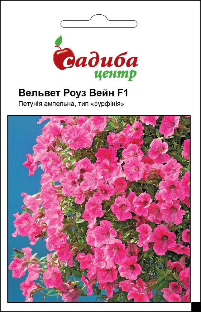 Петунія Вельвет Роуз Вейн F1 – ампельна петунія, утворює каскад довжиною 100 см. Квіти діаметром 5-5,5 см, рожевих відтінків з чіткими темно-рожевими прожилками. Для вирощування в горщиках насіння сіють на початку лютого, а для висаджування у відкритий грунт - наприкінці лютого-початку березня. Насіння висівають в ящики в парникову землю, воно швидко проростає при t 20-22 ° С. Рослини стійкі до шкідників і хвороб, відрізняються хорошим зростанням і високою схожістю насіння. Невимогливі до наявності тепла і сонця. Цвітуть з кінця червня і аж до заморозків. З успіхом використовуються скрізь, де виділяється їх каскадний характер (в кашпо, підвісних корзинах або для оформлення «квіткових дерев»).
