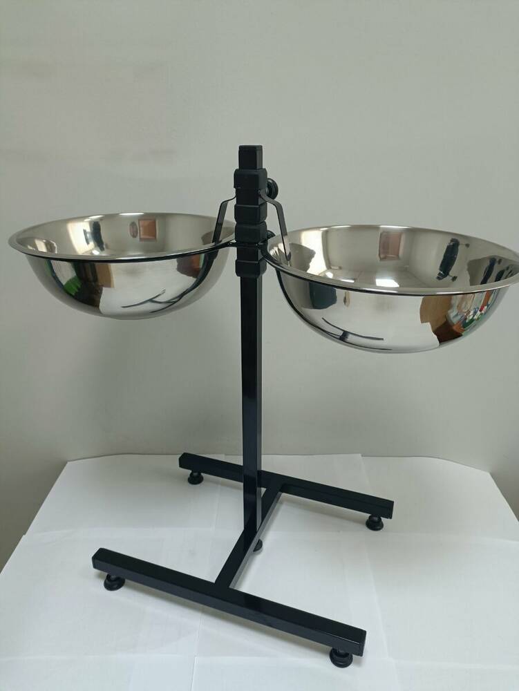 Підставка для собак виготовлена з металу з фарбовим покриттям, має регулюємі ніжки з пластику, завдяки чому рівно тримається на поверхні, не ковзає по підлозі та не дряпає її.