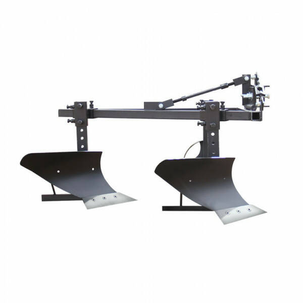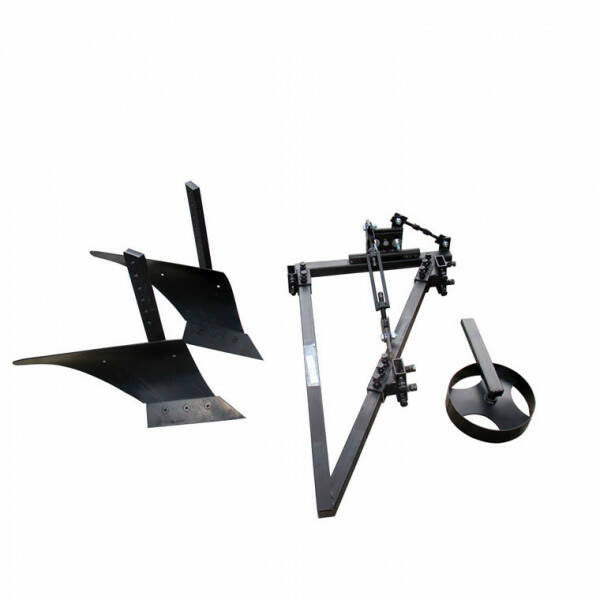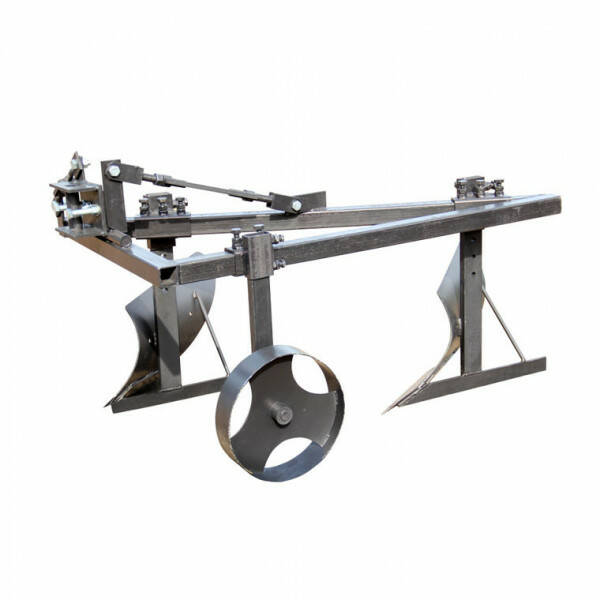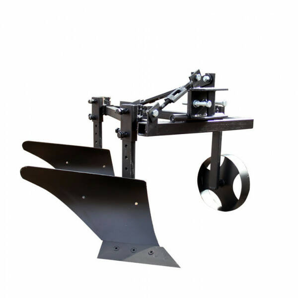 Основа двокорпусного плуга для мототрактора – трикутна рама. На одній з граней рами встановлені кронштейни кріплення корпусів. На протилежній грані встановлений кронштейн кріплення опорного колеса, за допомогою якого здійснюється регулювання глибини оранки. Максимальна глибина оранки двокорпусним плугом ПЛ7 – 150 мм. Ширина захвату плуга – 300 мм.