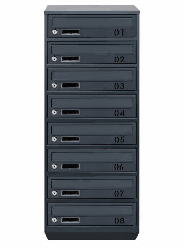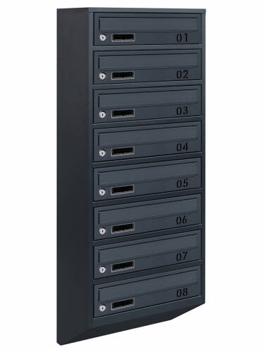 Поштовий ящик LEVMETAL багатосекціний Е1-08.B з колірним покриттям антрацит (RAL 7016) ідеально підходить для встановлення в багатоквартирних будинках. Косі секції з щілинами та клапанами забезпечують легкий доступ до кореспонденції.