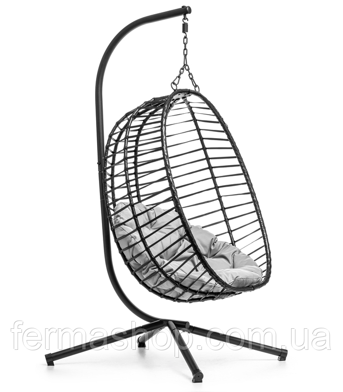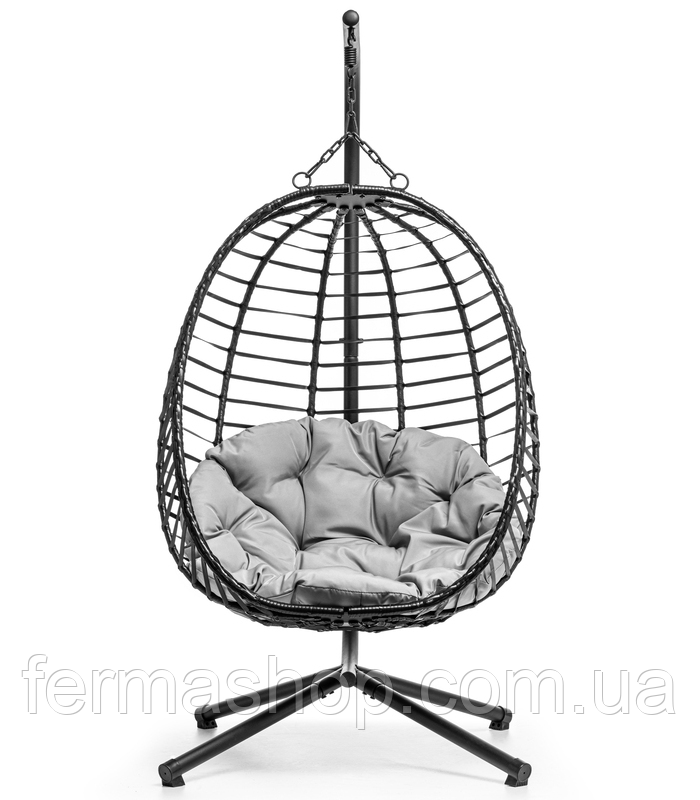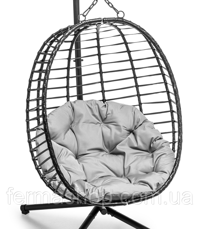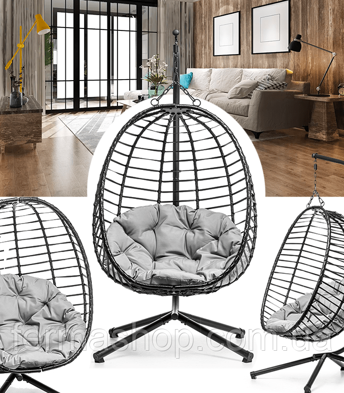 Подвесное кресло - идеальное решение для тех, кто ищет комфорт и отдых в современном стиле. Наше кресло отличается уникальным дизайном, сочетающим функциональность и эстетику. Несомненно, на эстетику и комфорт влияет большая красивая подушка серого цвета. Черное кресло с подушкой светлого цвета выглядит чрезвычайно элегантно. Прочная и устойчивая конструкция на 4 ножках привносит атмосферу современности. Большим преимуществом этого кресла является то, что его можно разложить на зимний сезон и хранить, например, в гараже, где оно не займет много места.