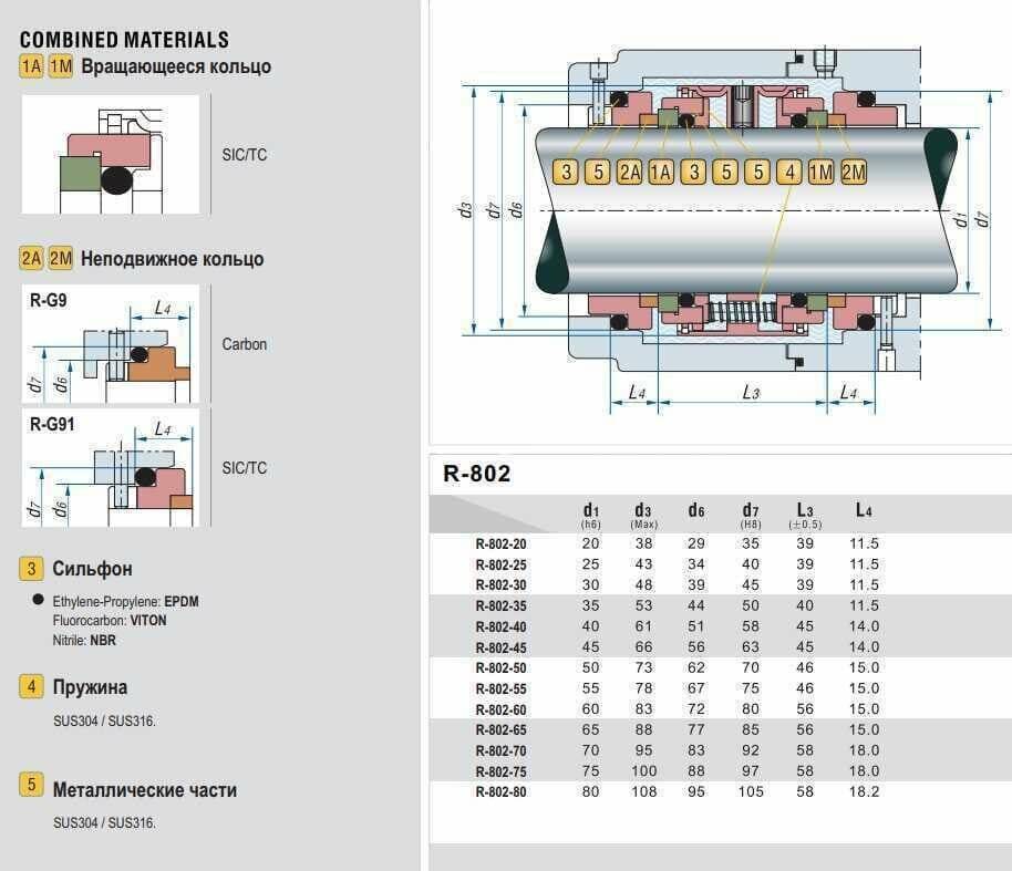 Подвійне торцеве ущільнення R-802 використовується при температурах від -20 до + 180°С, з тиском до 0,5 МПа і швидкістю обертання до 13 м/сек.
