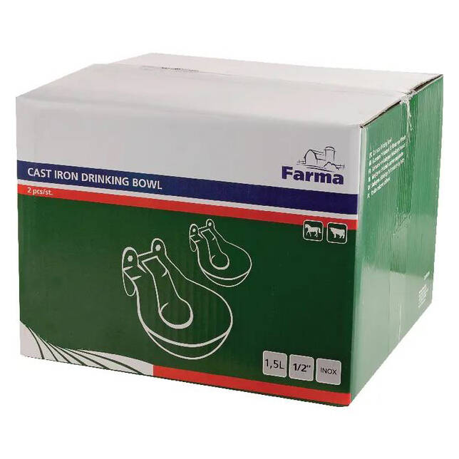 Чавунна автопоїлка Farma являє собою чашкову поїлку, призначену для ВРХ та коней. Чаша поїлки відлита з чавуну та покрита порошковою фарбою гарячим методом. Таке покриття чавуну забезпечує гарний захист від корозії та впливу води чи частинок корму, що лишається тваринами в процесі пиття. Язичок поїлки, призначений для натискання твариною з метою отримання свіжої води, виготовлений з якісної нержавіючої сталі. Поїлка має можливість під'єднання до води з двох сторін, що дозволяє підключити її до замкнутого контуру водопостачання.