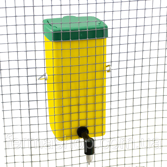 Обладнаний кронштейном з металу, який дозволяє кріпити поїлку до сітки або до клітки.