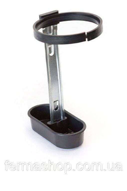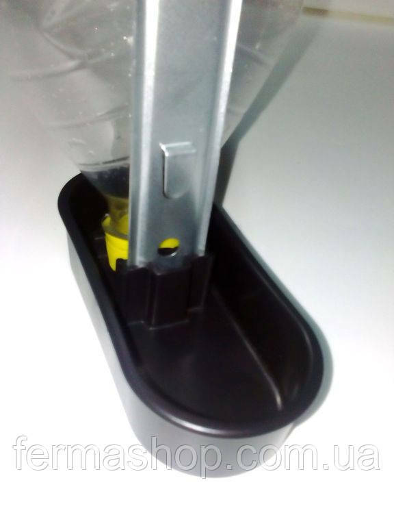 Поилка разборная, крепится непосредственно на сетку: цепляется «язычками», расположенными на стальной линейке, соединяющей пластиковое кольцо держателя бутылки и лоток поения. В качестве резервуара для воды используется пластиковая бутылка подходящего диаметра.