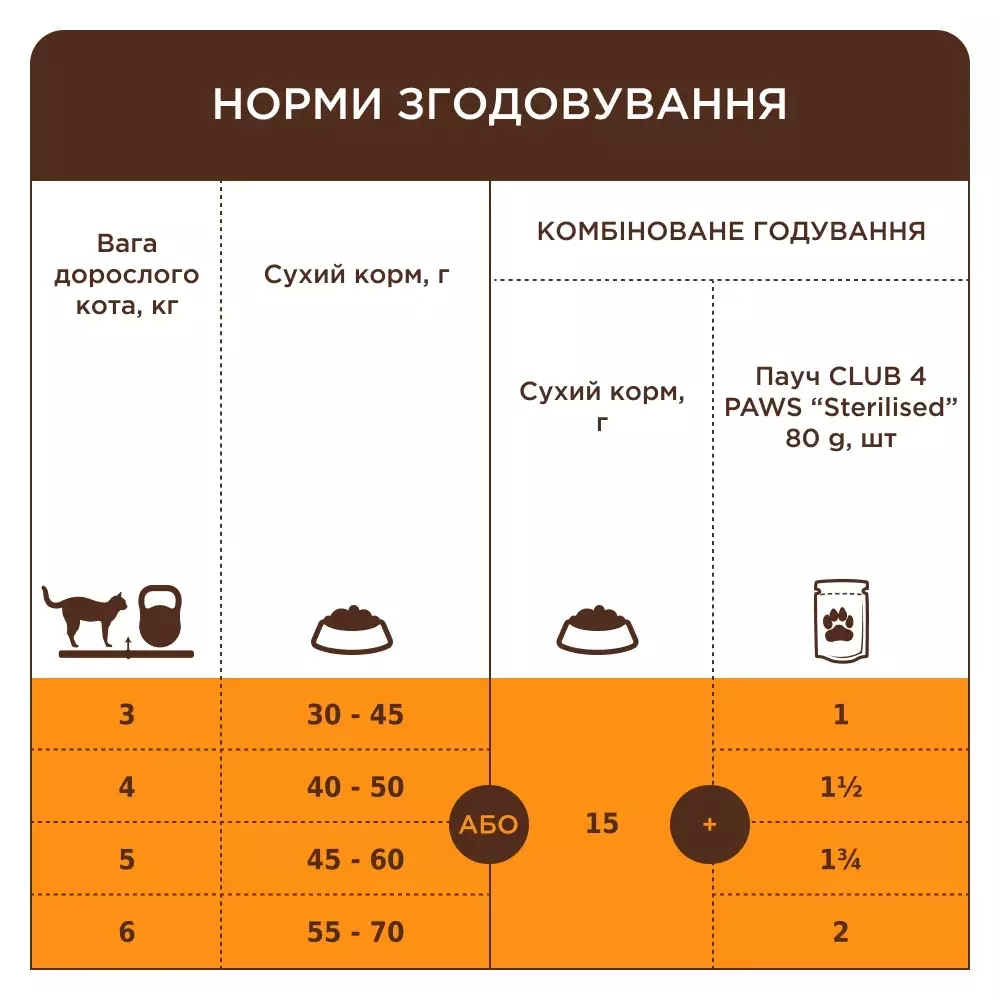 Корм потрібно вводити в раціон поступово (принаймні впродовж перших 5 днів). Забезпечити тварині постійний доступ до чистої та свіжої питної води. Індивідуальні норми годування тварини можуть варіюватися, залежно від віку, породи, рівня активності та довкілля. Комбінуйте годування з консервованими кормами Club 4 Paws для дорослих кішок. Більш детальні пропорції див. на фото 3 та на упаковці.