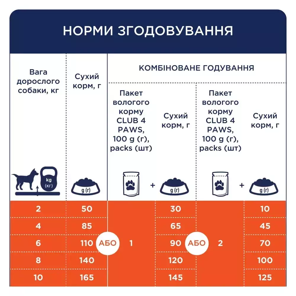 Корм потрібно вводити в раціон поступово (принаймні впродовж перших 5 днів). Забезпечити тварині постійний доступ до чистої та свіжої питної води. Індивідуальні норми годування тварини можуть варіюватися, залежно від віку, породи, рівня активності та довкілля. Комбінуйте годування з вологим кормом club 4 paws преміум "з куркою в желе". Більш детальні пропорції див. на фото 3 та на упаковці.