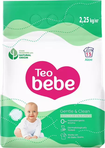 Спеціалізовані пральні порошки Teo bebe Gentle & Clean призначені для догляду за дитячою білизною. Спеціальна формула не містить жодних відомих алергенів, відмінно виводить плями та безпечна навіть для новонароджених дітей.