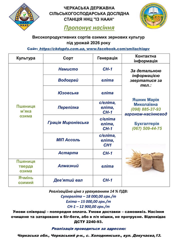 Високопродуктивних сортів озимих зернових культур під урожай 2026 року