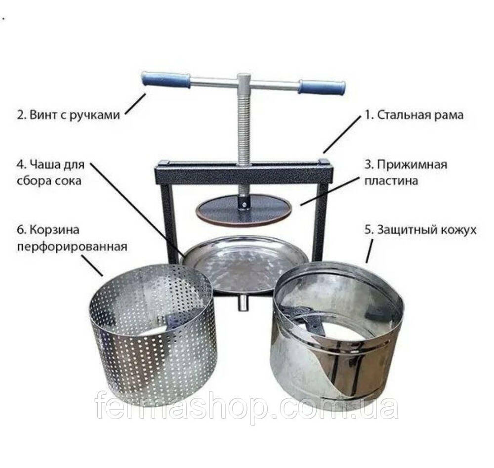 Прибор образован сварной рамой, перфорированной корзиной для фруктов и ягод, резьбовой группой винт-гайкой, посудой для сбора готового сока.