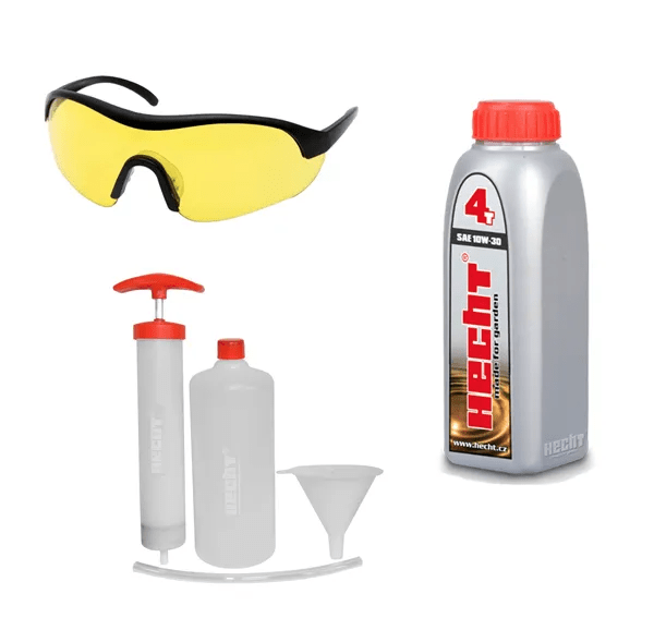З кожним товаром HECHT що оснащени бензиновим двигуном ми даруємо комплект для обслуговування. В нього входять баночка 4Т масла, комплект для відкачки масла та яскраві захисні окуляри.