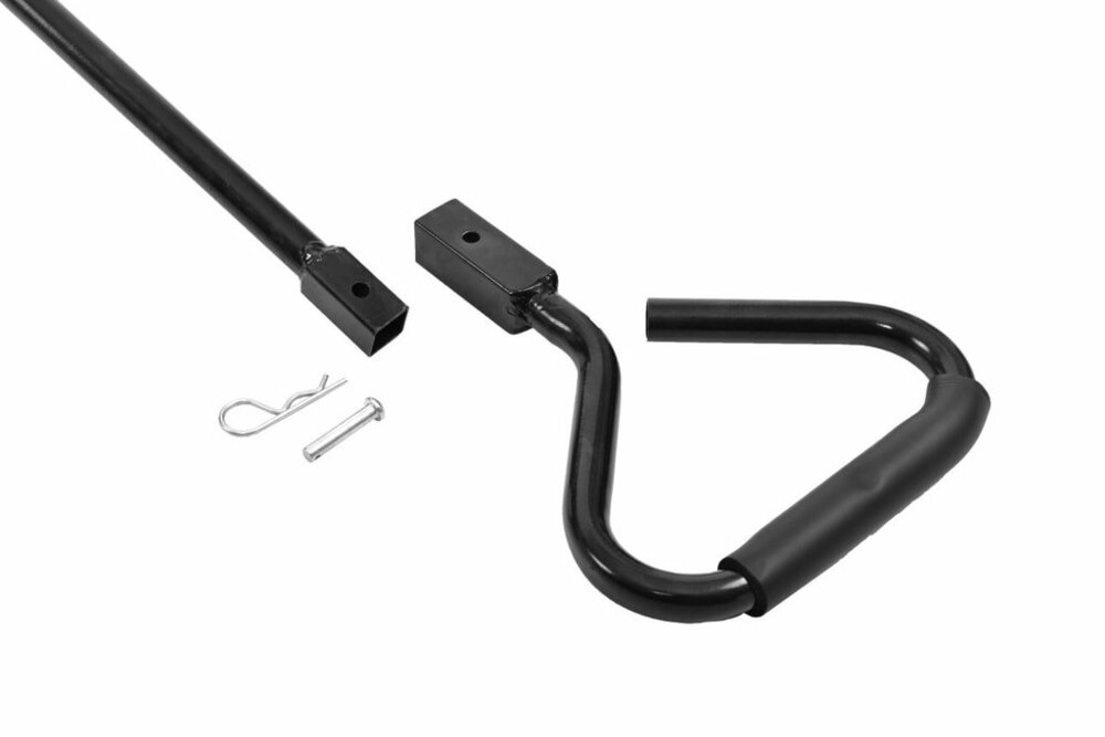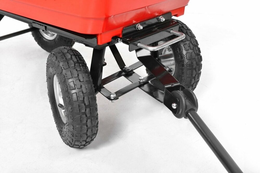 Рукоятка знімається, що звільняє сполучну частину, яка дозволяє підвісити візок до трактора, такому як газонний трактор. Таким чином, ви отримуєте супер практичне причіпний пристрій!