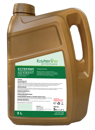 ЕСТЕРЛИП – это вспомогательное поверхностно-активные вещество, которое используется вместе с современными средствами защиты растений в Украине. Действие ЕСТЕРЛИП заключается в уменьшении поверхностного натяжения химического препарата или его водного раствора, который наносится на растение, как правило, на листья культур. На поверхности листа образуется специальная, достаточно однородная пленка, которая удерживает пестициды ( гербициды, инсектициды или другие подобные химические вещества) на растениях и способствует их максимальному поглощению.