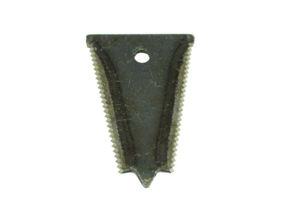Властивості: сталева пластина трапецеподібна з гострими зазубреними бічними гранями, виготовлена ??з легованої сталі, загартована для підвищення опору зламу і збільшення зносостійкості. В основі виконано кріпильний отвір. Сегмент з'єднується зі спинкою коси заклепками або різьбовим з'єднанням.