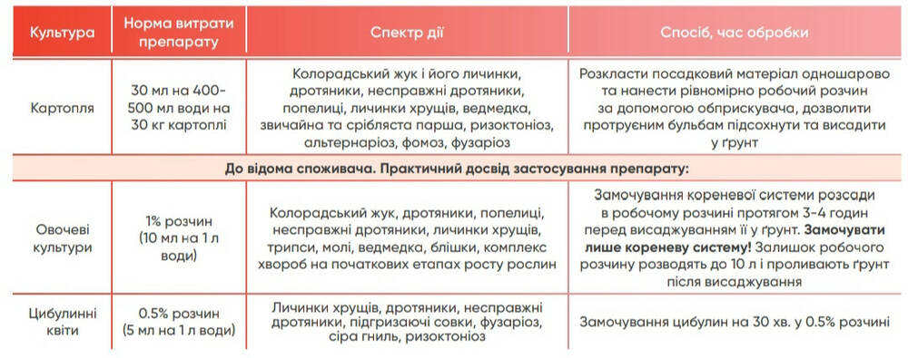 | Овощные культуры | 1% раствор (10 мл на 1 л воды) | Колорадский жук, проволочники, тля, ненастоящие проволочники, личинки майских жуков, трипсы, моли, медведка, блошки, комплекс болезней на начальных этапах роста растений | Замачивание корневой системы рассады в рабочем растворе в течение 3-4 часов перед высадкой в грунт. Замачивать только корневую систему! Остаток рабочего раствора разводят до 10 л и проливают почву после высадки |