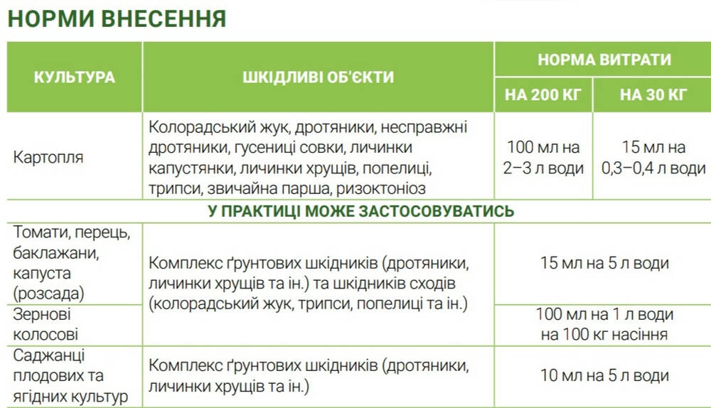 | Картофель | Колорадский жук, проволочника, ненастоящие проволочника, гусеницы совки, личинки медведки, личинки майских жуков, тли, трипсы, обычная парша, ризоктониоз | 100 мл на 2 - 3 л воды | 15 мл на 0,3-0,4 л воды |
