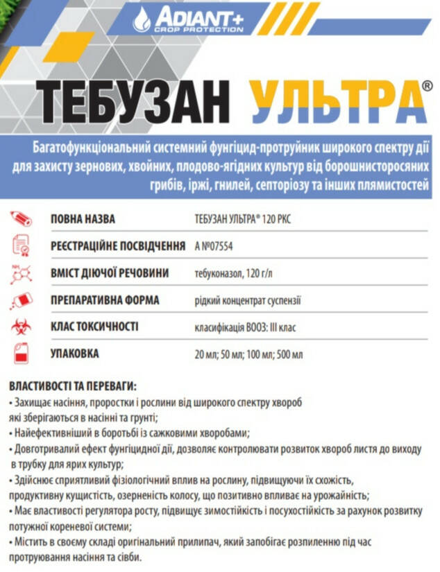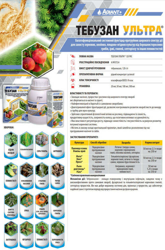 Тебузан Ультра - Многофункциональный системный фунгицид-протравитель широкого спектра действия для защиты зерновых, хвойных, плодово-ягодных культур от мучнисторосяных грибов, ржавчины, гнилей, септориоза и других пятнистостей.