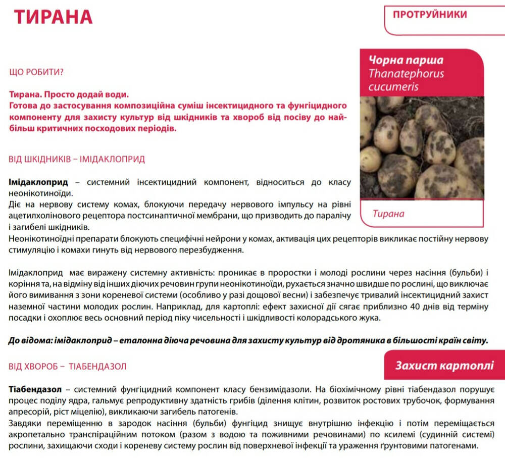 Не секрет, что против поверхностной клубневой инфекции перед посадкой клубни обрабатывают препаратами фунгицидного действия, а против почвенных и наземных вредителей (проволочника, колорадского жука, тли, цикадок - переносчиков вирусных и микоплазменных болезней) - инсектицидами. Обработка двумя отдельными препаратами и самостоятельное формирование баковой смеси имеет достаточно недостатков, среди которых правильность подобранной дозировки, возможность создания баковой смеси (смешивание двух компонентов) и, время, за которое данная смесь формируется и используется. Именно поэтому, наиболее оптимальным решением является использование уже готовых двухкомпонентных рецептурных препаратов, одним из которых является - протравитель Тирана.