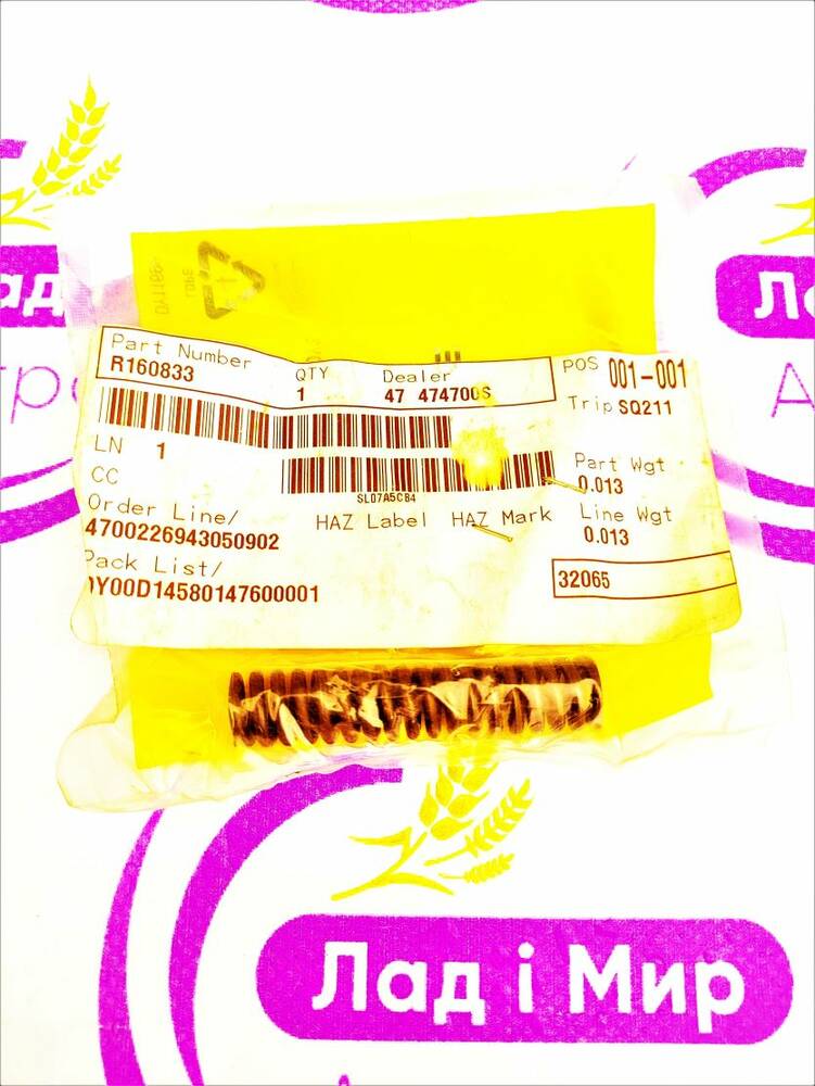 Пружина компресійна R160833 на техніку John Deere Компанія John Deere одна з самих популярних та відомих серед виробників запчастин до сільгосптехніки. Надійність та якість продукції визнана усім світом. Про це свідчить представництво техніки виробника John Deere на усіх континентах. Ви можете замовити агрозапчастини Пружина компресійна R160833 на техніку John Deere від виробника John Deere на нашому сайті . Якщо у Вас виникли додаткові запитання по запчастині Пружина компресійна R160833 на техніку John Deere до техніки John Deere, Ви можете зателефонувати за телефонними номерами. Всі номери вказані на сайті . Наші фахівці мають великий досвід. Вони нададуть всю вичерпну інформацію на агрозапчастини до техніки John Deere. Також в разі випадку, запропонують альтернативу. Це можуть бути інші агрозапчастини до сільгосптехніки таких відомих виробників як Claas,  New Holland, Challenger, Fendt, Great Plains, Horsch, Case, Kinze, Massey Ferguson. Компанія "Лад і Мир агро" - це Ваш надійний партнер. Ми зробимо все можливе і неможливе. Ми якомога швидко доставимо до Вас Пружина компресійна R160833 на техніку John Deere до техніки John Deere в найкоротший термін. Ми співпрацюємо з усіма перевізниками по всій Україні. Лад і Мир Вашому господарству! Переглянути інші товари виробника на нашому сайті.  Компанія ТОВ «Лад і мир агро» є надійним партнером для сільськогосподарського виробника для замовлення оригінальної запчастини на сільськогосподарську техніку. Головним принципом є надання професійної підтримки і забезпечення потреб в запасних частинах для агротехніки для кожного клієнта нашої компанії. У нас ви можете замовити оригінальні агрозапчастини від таких відомих виробників, як Claas, Challenger, Fendt, Great Plains, Horsch, John Deere, Kinze, Massey Ferguson та інших. Для цього можете перейти до нашого каталогу –