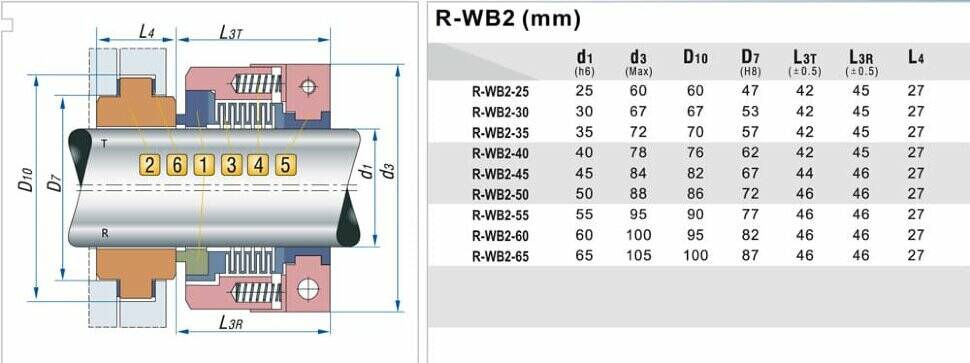 Ущільнення R-WB2T з сильфоном із тефлону (PTFE), стійке до сильної корозії і високих концентрацій кислот, солей, сильних окислювачів і хімічно активних органічних сполук. Призначене для зовнішнього монтажу.