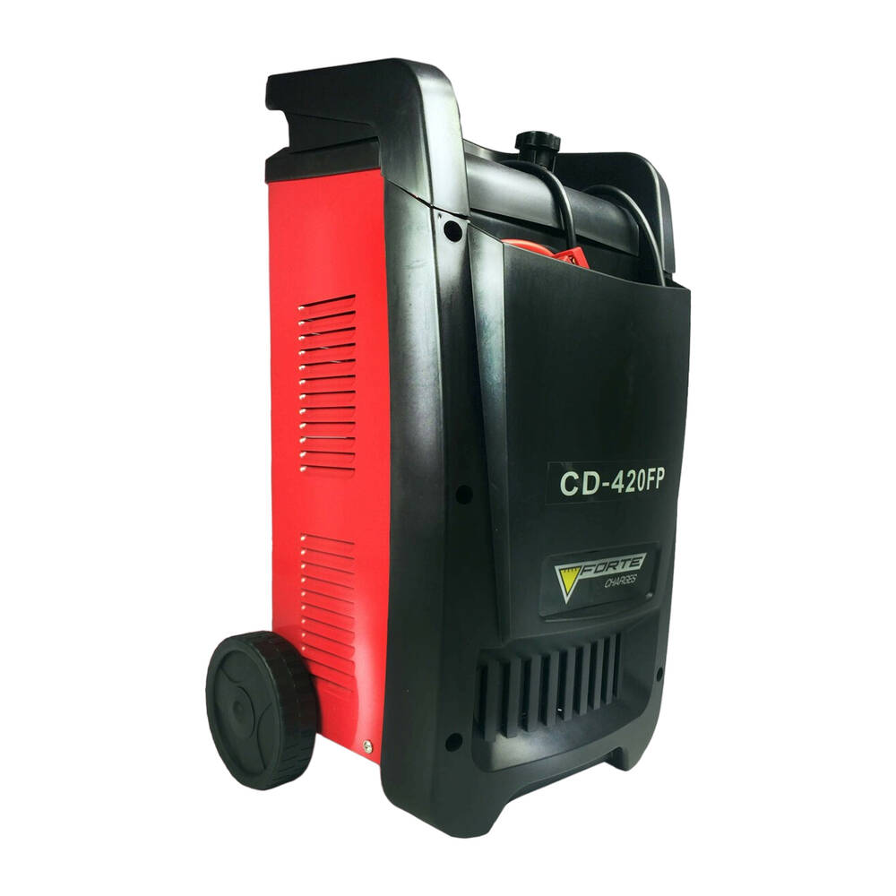 Опис Forte CD-420FP Пускозарядний пристрій Forte CD-420FP - потужне портативне пуско-зарядний пристрій для автомобілістів, призначене для роботи з широким діапазоном ємностей і типів акумуляторів, а також запуску двигунів практично всіх видів. Установка може з легкістю переміщатися в допустимих межах, за рахунок наявності зручної рукоятки і транспортувальних коліс. Панель управління зосереджена на верхньому торці, складається з: аналогово амперметра, перемикача величини напруги, ручки для плавного регулювання сили струму. На нижній частині корпусу розташувалися вихідні дроти для підключення до них зовнішніх установок. Також виробник передбачив спеціальну кишеню для зберігання кабелів. Пуско-зарядний пристрій працює від побутової мережі напругою 220В. При споживаної потужності в 950 Вт може виробляти напругу 12 і 24 V. Також може заряджати акумулятори з мінімальною ємність в 100 А / ч, максимальної - 600 А / ч. Граничний струм зарядки дорівнює 27 А, максимальний струм запуску - 400 А. Потужність зарядки становить 1,6 кВт, запуску - 10кВт. Forte CD-420FP - надійна модель з широким діапазоном можливостей. Незважаючи на віднесення до класу портативних пристроїв, може використовуватися в професійному сегменті автомобільних послуг. Особливості: Однофазное, портативний зарядний пристрій для акумуляторів напругою 12 / 24В Ступінь захисту IP23 Захист від перенапруги і неправильного підключення Можливість використовувати в складних умовах