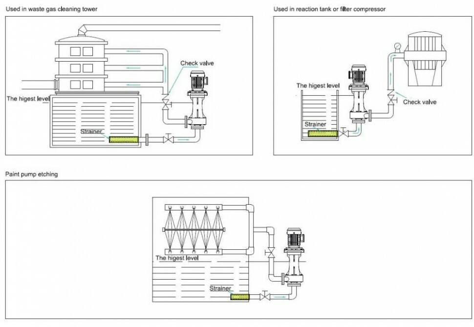 Установка насоса- напівзанурювальний , зовнішня установка. Напівзанурювальний насос може і бути встановлений з зовні або зручному місці, що дозволяє забезпечити фільтраційну систему подачі компактними розмірами, зручним обслуговуванням і контролем. Матеріали насоса в залежності від вимог технології представлені в різних варіантах для вибору.