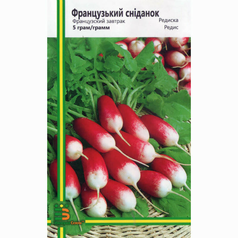 Редис Французький сніданок - це ранній сорт. Період вегетації від повних сходів до технічної зрілості становить 20-25 днів. Форма коренеплоду циліндрична, яскраво-червоного кольору із білим кінчиком. Середній діаметр 1,5-2,5 см, вага 15-20 г. М'якуш білий, щільний, соковитий. Без гіркоти. Використовуються свіжими, а також у салатах, закусках, окрошці. Характеризується дружнім дозріванням коренеплодів. Врожайність 0,8-2,1 кг/м2.