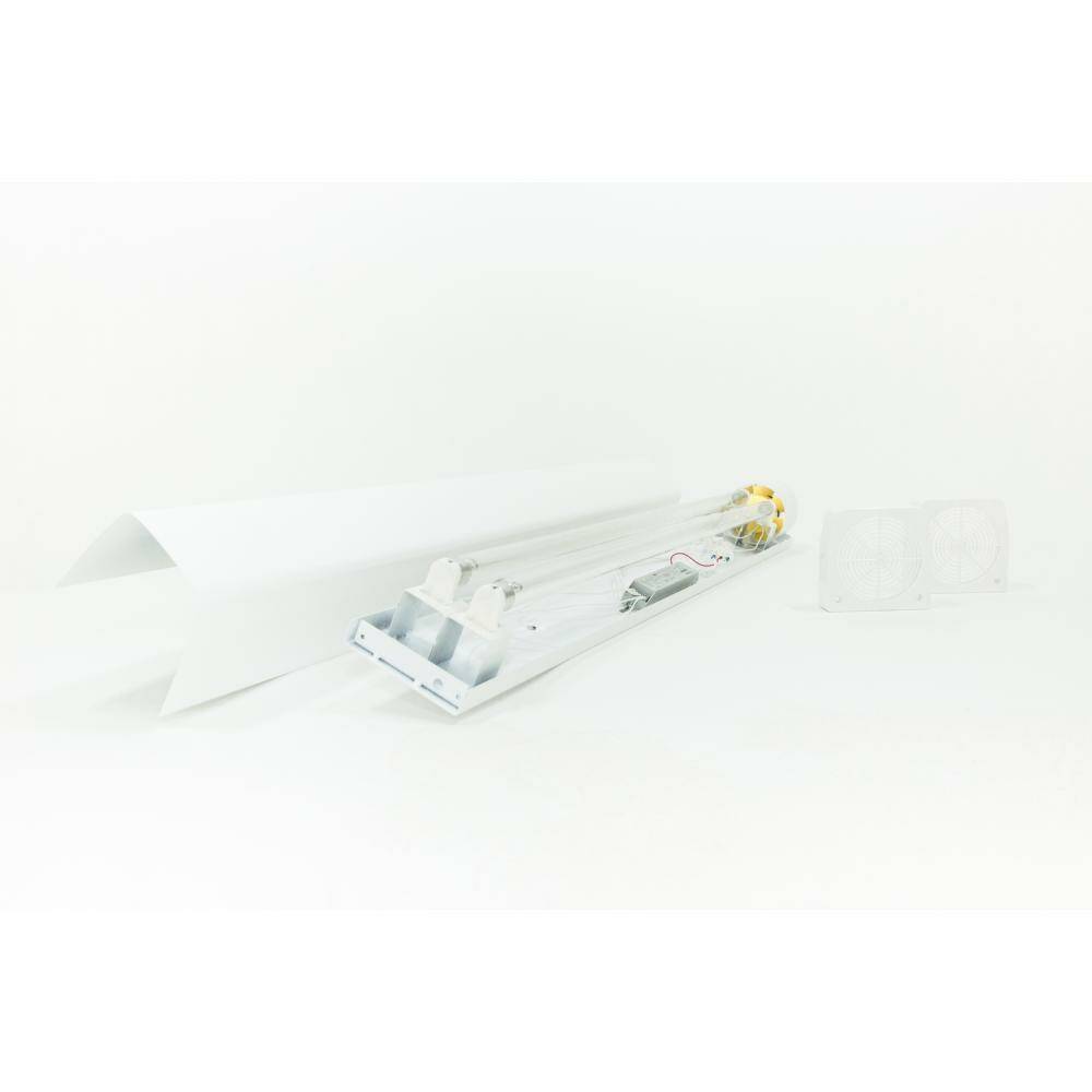 Рециркулятор бактерицидний Аерекс Стандарт 2×30 призначений для знезараження повітря від вірусів, бактерій, грибкових спор та інших мікроорганізмів. Робота ґрунтується на примусовій циркуляції повітря через камеру з двома безозоновими бактерицидними лампами, які випромінюють ультрафіолет із довжиною хвилі 253,7 нм. Осьовий вентилятор забезпечує рівномірний рух повітряних мас через внутрішню камеру, що гарантує ефективне знезараження у присутності людей.