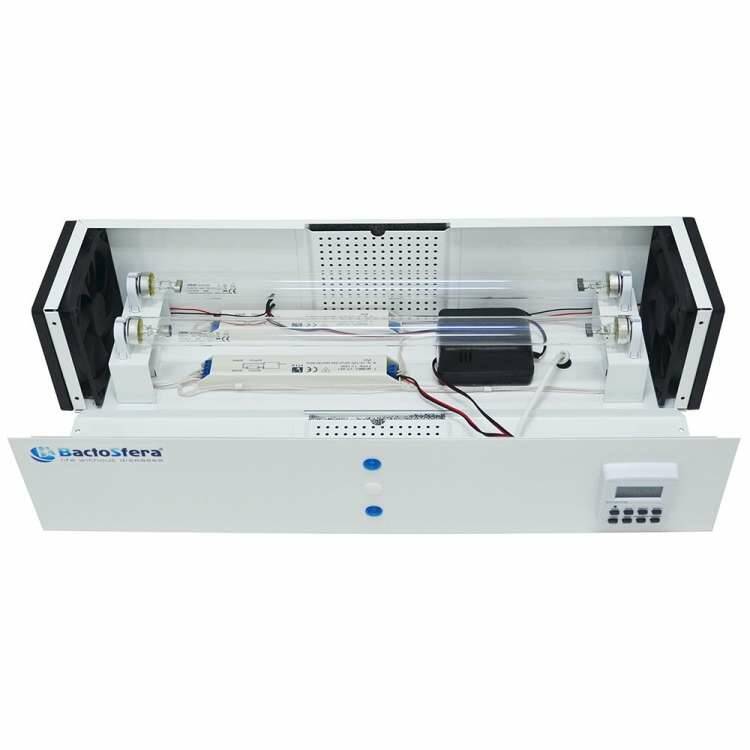 • Конструкція. У рециркуляторі встановлено два витяжних вентилятори. Крім цього на бічних стінках приладу встановлено два повітрозабірника з захистом від зовнішнього проникнення прямих УФ-С променів. Така конструкція збільшує швидкість повітропрохідності до двох разів, що сприяє більш швидкому знезараженню повітря. Усередині корпусу опромінювача на кріпильних отворах розміщені герметичні кришки для утримання тяги (швидкості руху повітря). Корпус приладу легко демонтується для  техобслуговування.