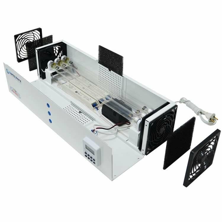 • Конструкція. В рециркуляторі встановлено два витяжних вентилятори. Крім цього на бічних стінках приладу встановлено два повітрозабірника з захистом від зовнішнього проникнення прямих УФ-С променів. Така конструкція збільшує швидкість повітропрохідності до двох разів, що сприяє більш швидкому знезараженню повітря. Усередині корпусу опромінювача на кріпильних отворах розміщені герметичні кришки для утримання тяги (швидкості руху повітря). Корпус приладу легко демонтується для  техобслуговування.